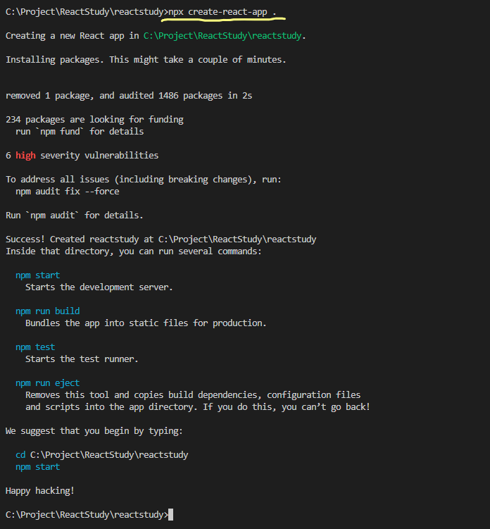 2. vscode 터미널 창에 npx create-react-app . 을 입력하세요