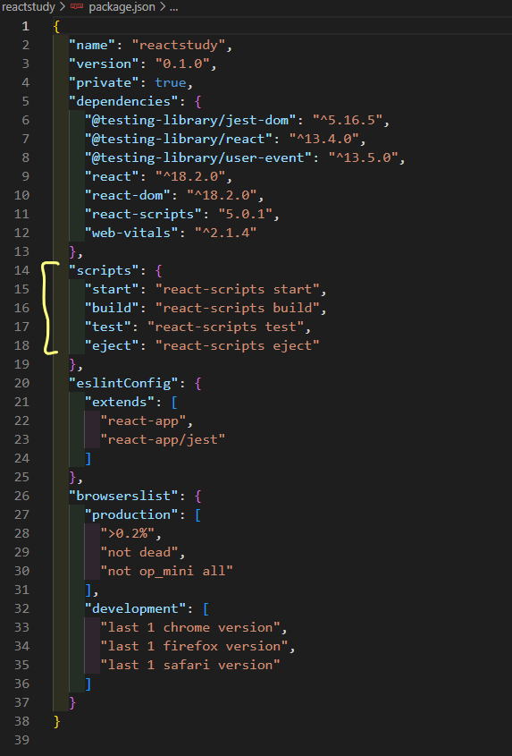 명령어를 이용해 리액트 앱을 실행하고 종료하겠습니다. 리액트 앱을 실행하는 명령어는 package.json 의 scripts 에 작성되어 있습니다.