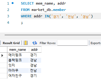 addr이 경기, 전남, 경남인 데이터를 찾고 싶을 때에는 OR문으로도 쓸 수 있지만