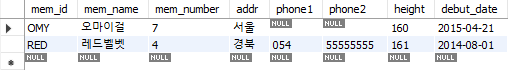 INSERT INTO member VALUES('OMY', '오마이걸', 7, '서울', NULL, NULL, 160, '2015.04.21');