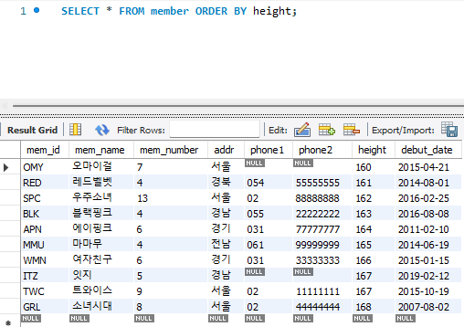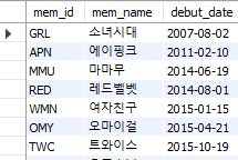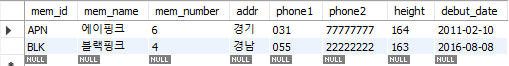 SELECT addr, debut_datee FROM member; -- member 테이블의 addr, debut_date 열 가져오기