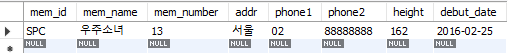 INSERT INTO member VALUES('SPC', '우주소녀', 13, '서울', '02', '88888888', 162, '2016.02.25');