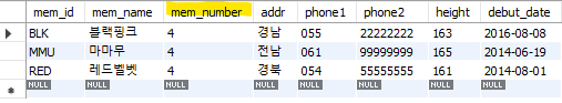 SELECT addr, debut_datee FROM member; -- member 테이블의 addr, debut_date 열 가져오기