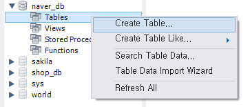 만든 데이터베이스를 확장한 후 tables에 우클릭하여 Create table을 선택합니다.
