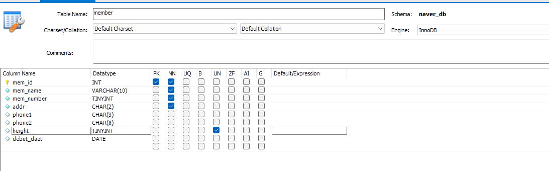 테이블의 칼럼을 구성합니다. PK와 NN, Datatype은 아래 게시물을 참고해 주세요
