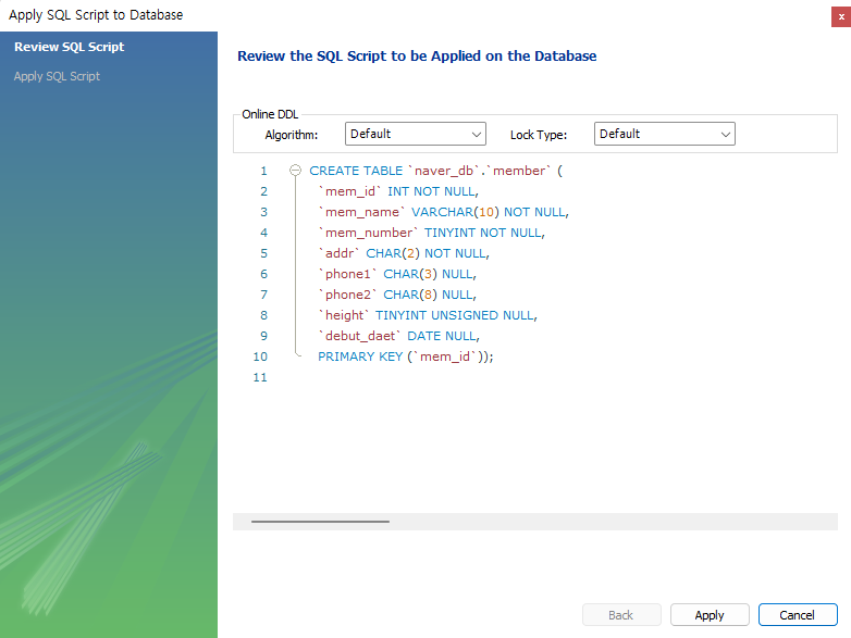 apply를 클릭하면 테이블이 생성된 것을 확인할 수 있습니다.