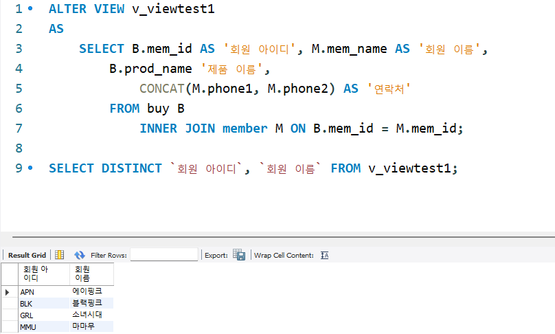 뷰의 수정은 ALTER VIEW 구문을 사용하며, 열 이름에 한글을 사용해도 됩니다