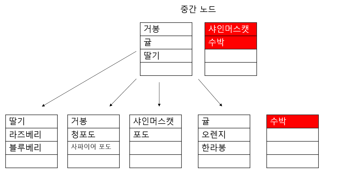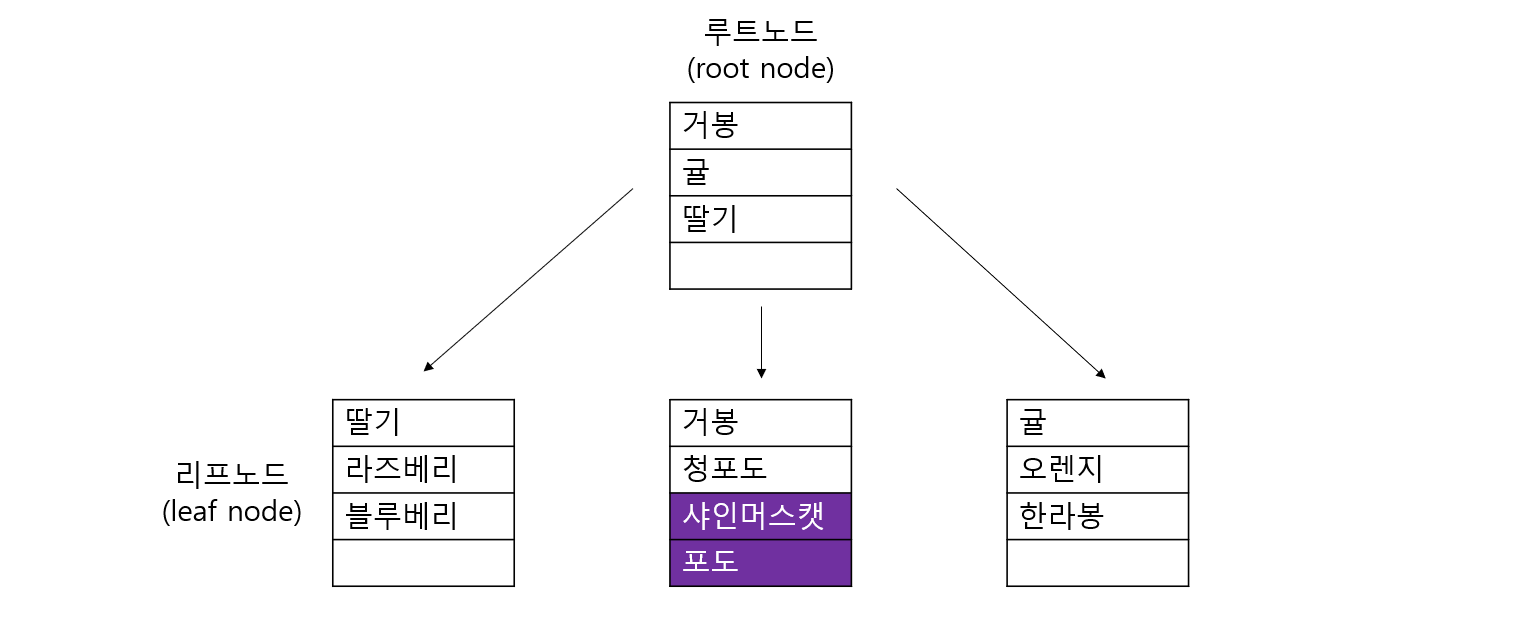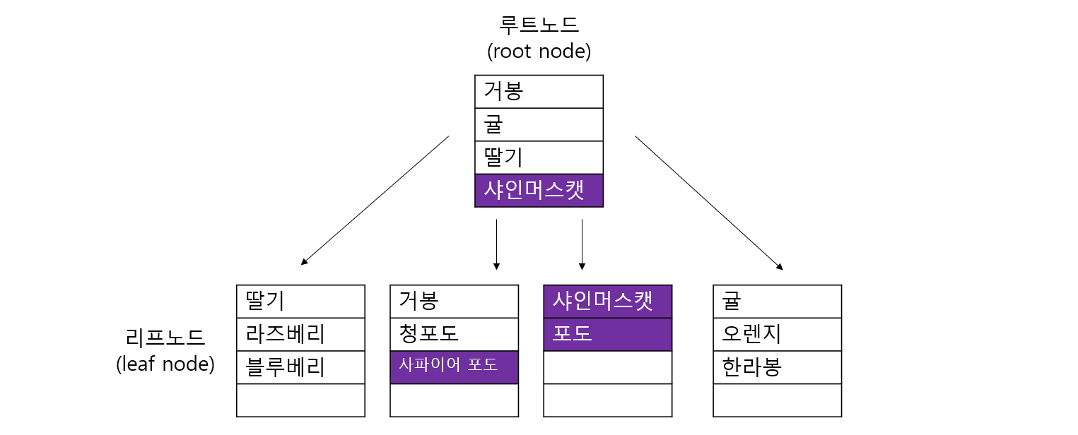 사파이어 포도를 입력하고 보니 두번째 리프페이지에 데이터가 들어갈 공간이 없어, 샤인머스캣과 포도 데이터가 새로운 페이지로 나뉘어 졌고(가나다순 데이터 정렬), 루트 노드에 새로운 페이지가 등록되었습니다.