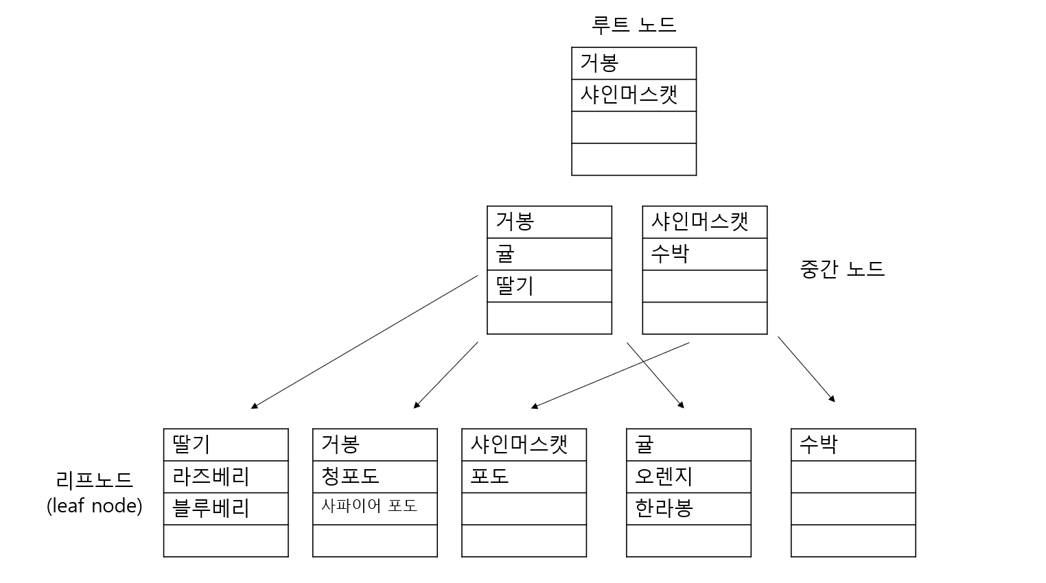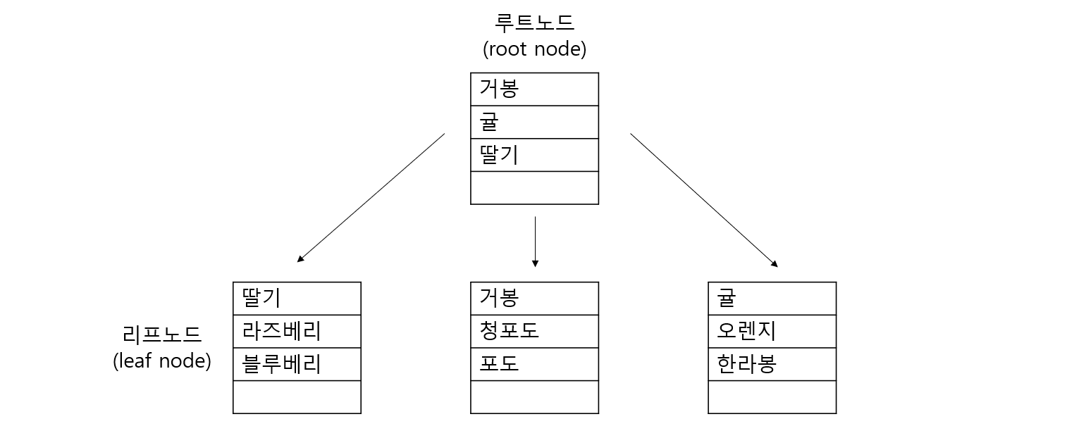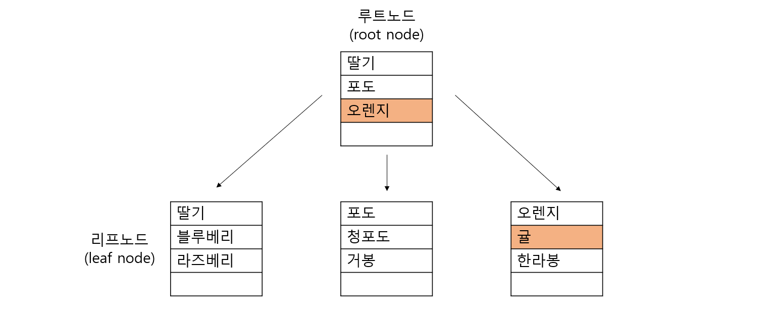 위의 그림에서 귤이라는 데이터를 검색한다고 할 때, 리프 페이지만 존재한다면 귤을 처음부터 검색해야 합니다