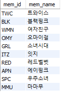 INSERT INTO cluster VALUES('TWC', '트와이스');