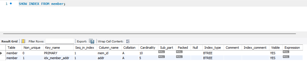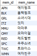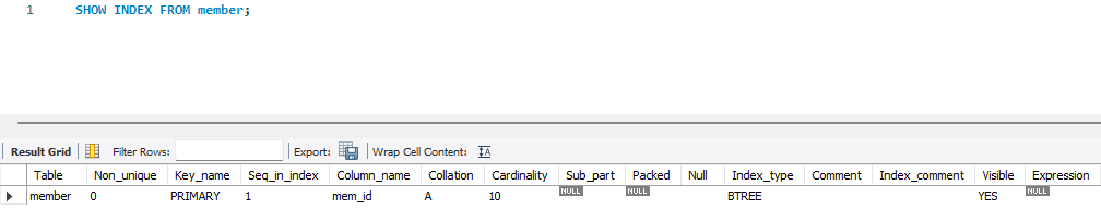mem_id열을 Primary key로 지정하여 mem_id를 기준으로 테이블이 오름차순 정렬되었습니다.