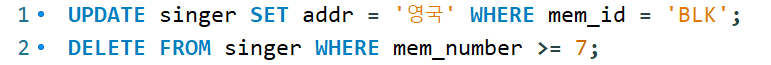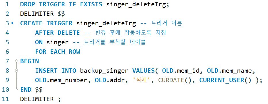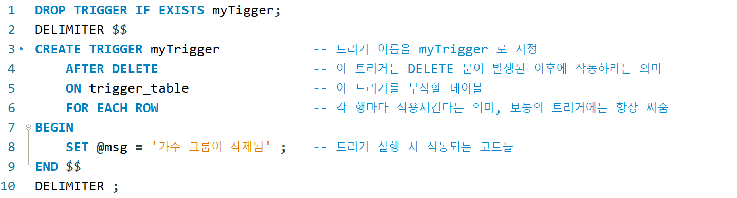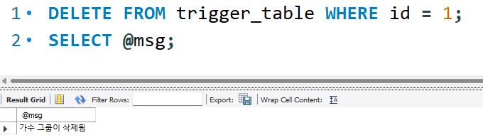 SET @msg = '가수 그룹이 삭제됨' ; -- 트리거 실행 시 작동되는 코드들