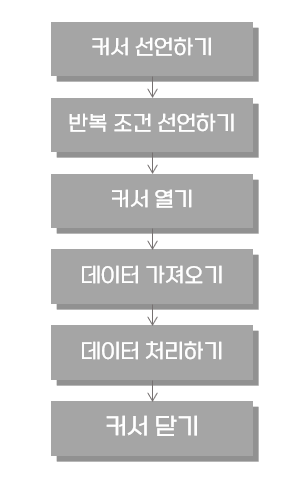 커서는 다음과 같은 작동 순서를 통해 처리되며, 대부분 스토어드 프로시저와 함께 사용됩니다.