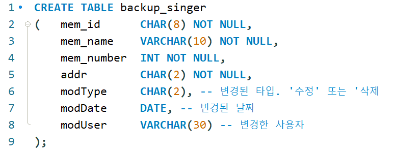 가수 테이블에 INSERT나 UPDATE작업이 일어나는 경우, 변경 전의 데이터를 저장할 백업 테이블을 미리 생성합니다.