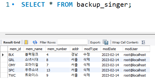 OLD테이블은 UPDATE나 DELETE가 수행될 때, 변경하기 전의 데이터가 잠깐 저장되는 임시 테이블입니다. OLD를 이용하여 backup_singer에 수정 전 데이터를 입력합니다.